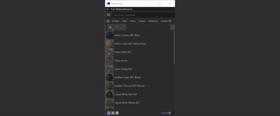 Search bar for Cinema 4D to filter materials in the Material Manager by name.